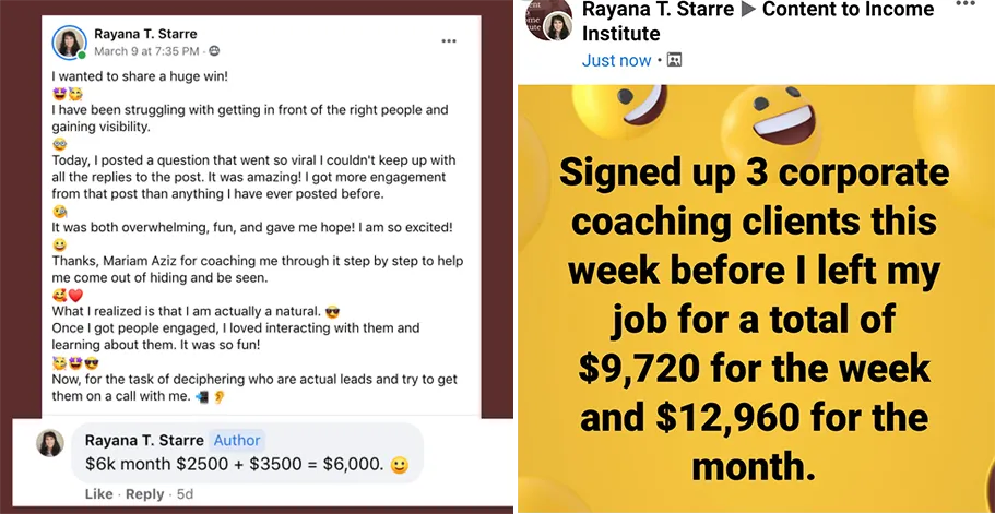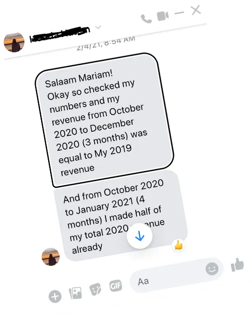 I’ve been able to increase my price! My content has now purpose and direction. I have been having a lot of engagement. My fear and doubts regarding what to post, why and how are now answered. This shift helped me finally make my business profitable - planned and strategized! I feel well supported and confident. Now when things don't work out, I know there's a missing puzzle piece and Mariam is able to help me overcome those blocks.